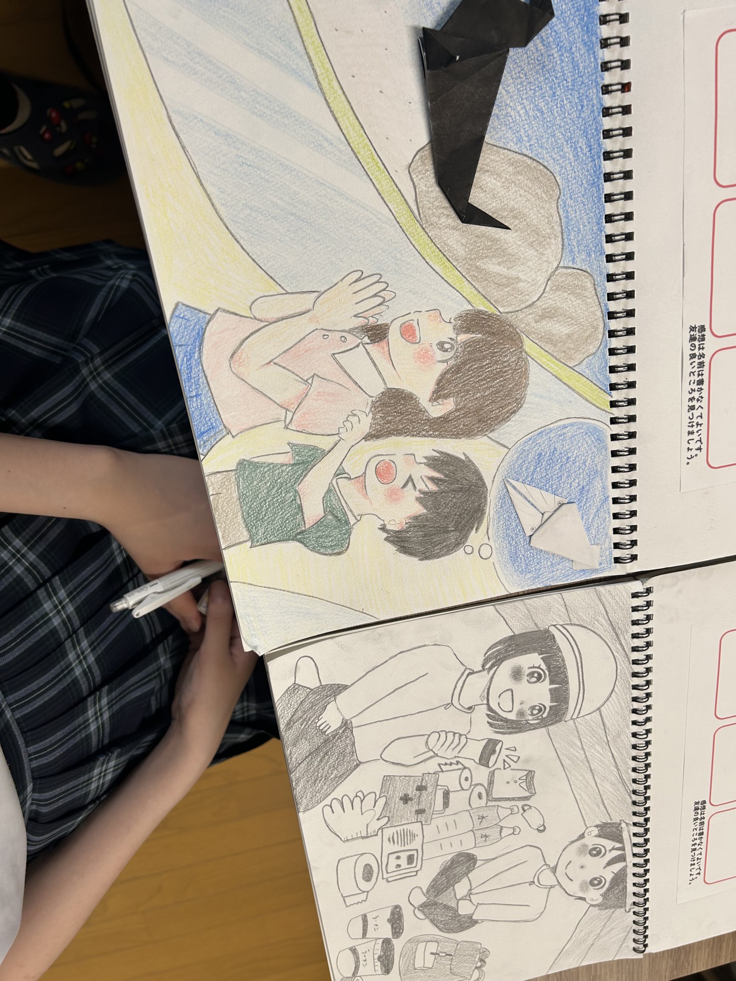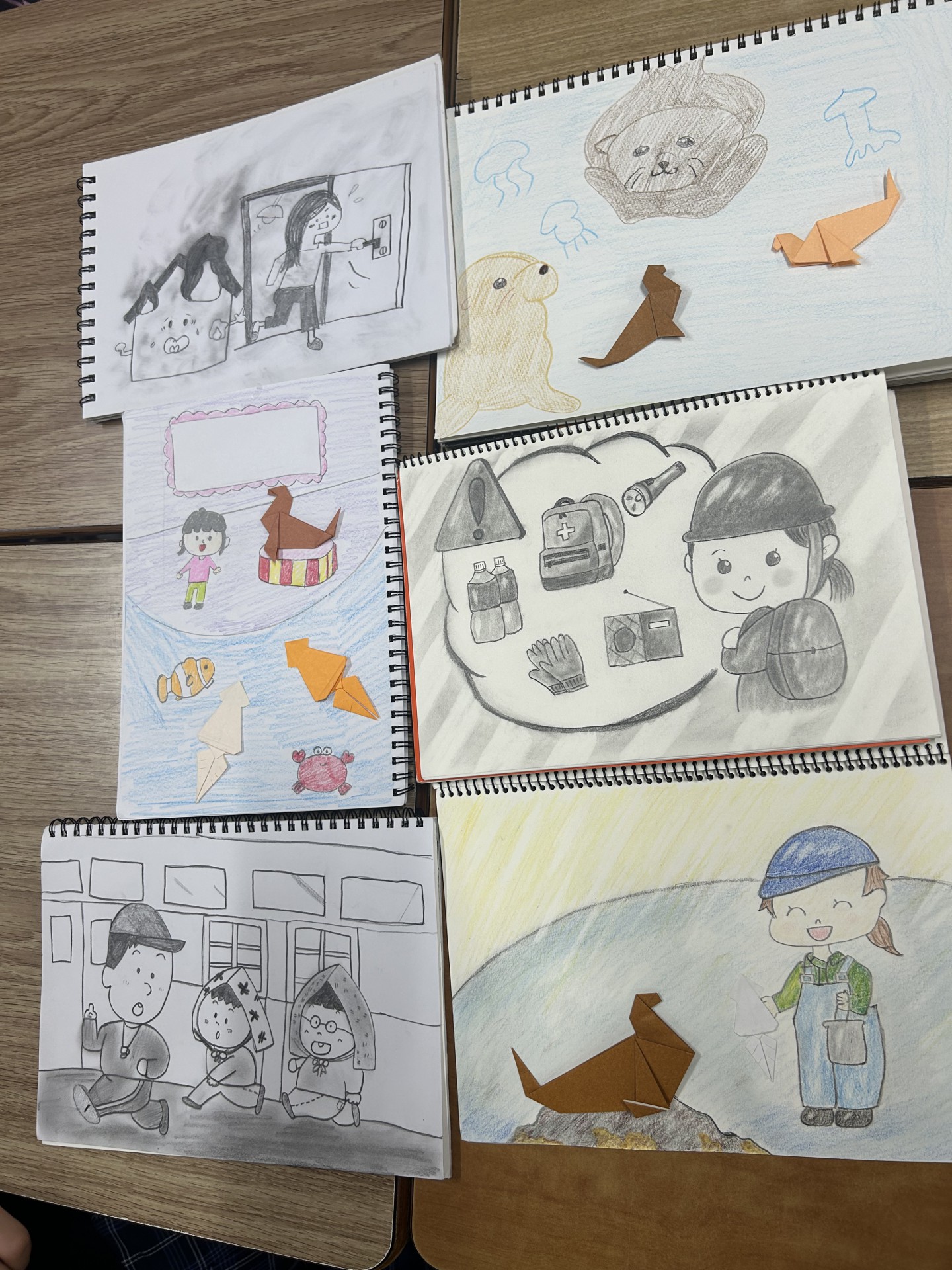 折り紙は、課題2つを折って、構成を考え背景を描いて仕上げます。