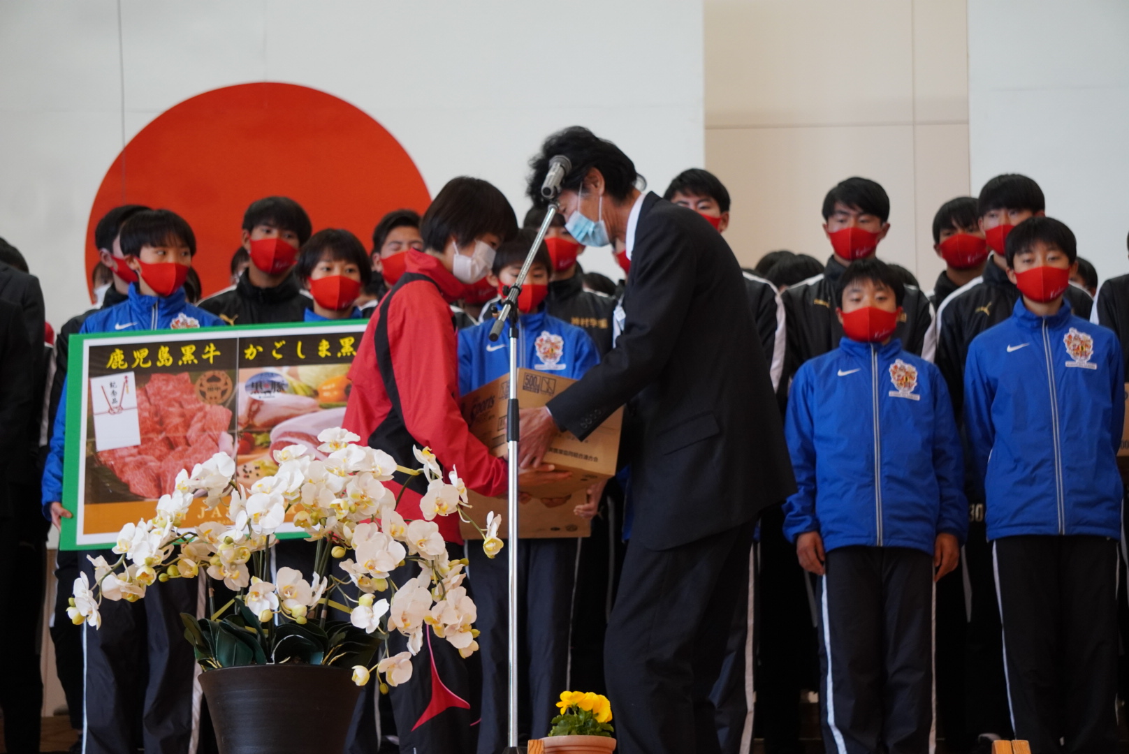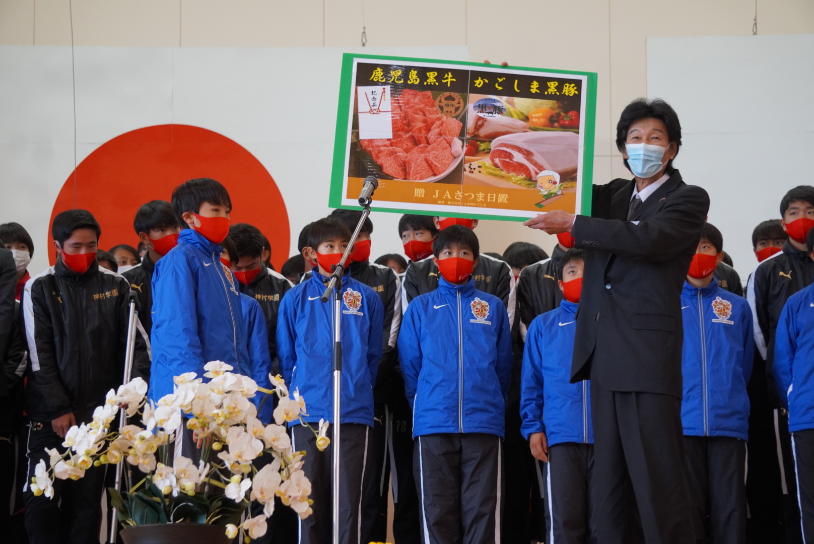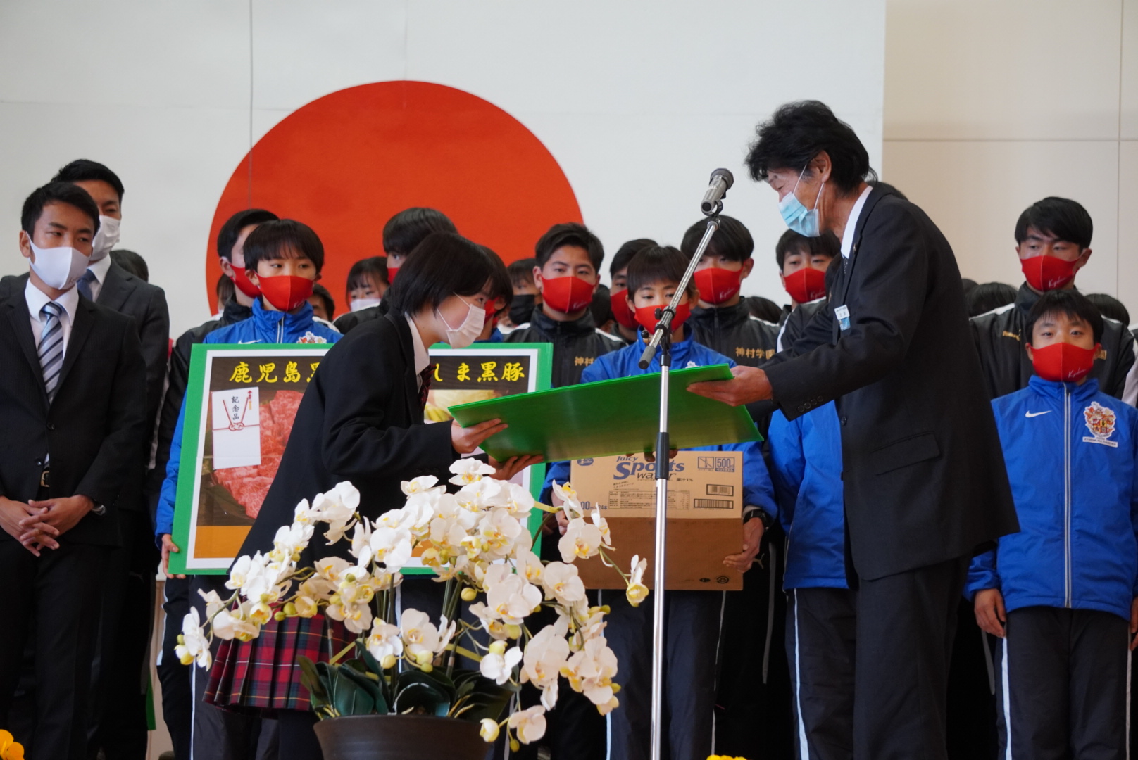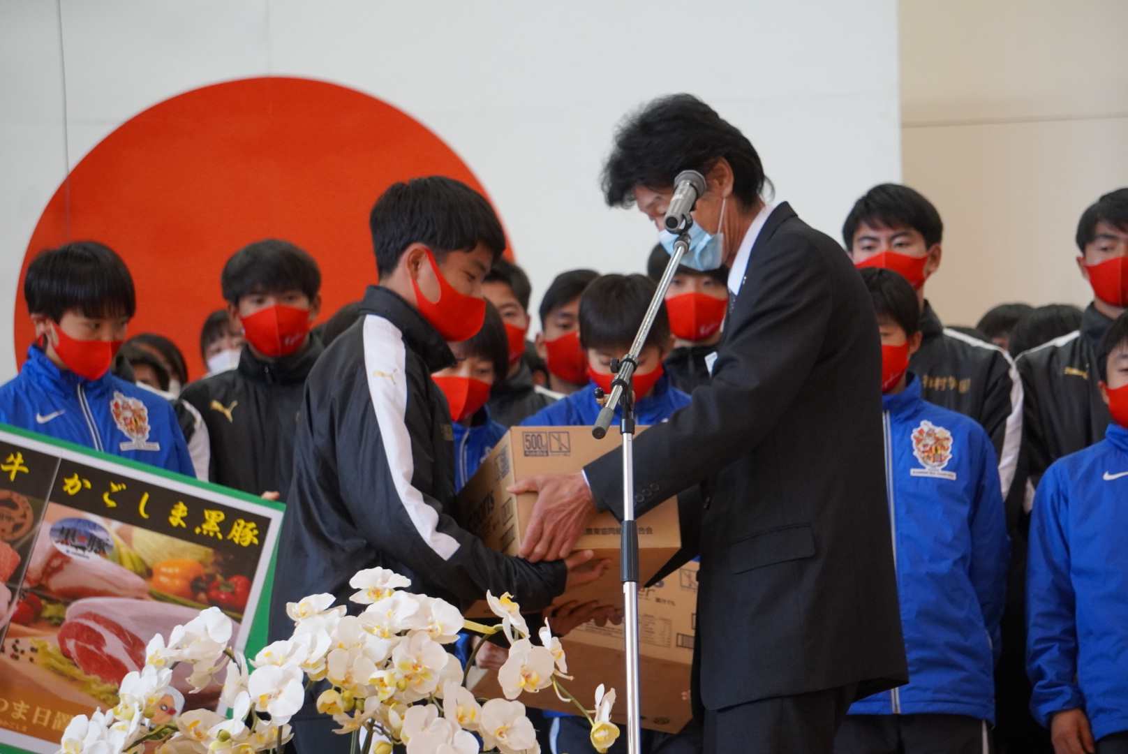 JAさつま日置様より 農畜産物贈呈式🥩 2021.12.14高等部 お知らせ吹奏楽女子サッカー女子ソフトボール男子サッカー駅伝 全国大会に出場する5団体(駅伝部,男子サッカー部,女子サッカー部,吹奏楽部,ソフト部)に対し,JAさつま日置様より農畜産物贈呈式が行われました。 栄養をしっかりとって,全国大会に挑みます。ありがとうございました。