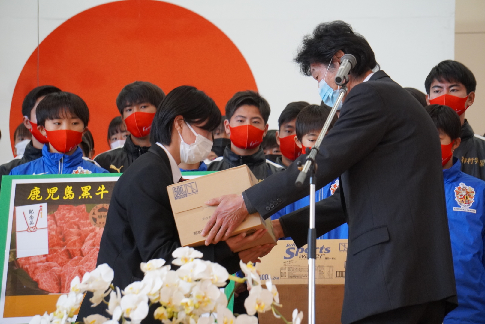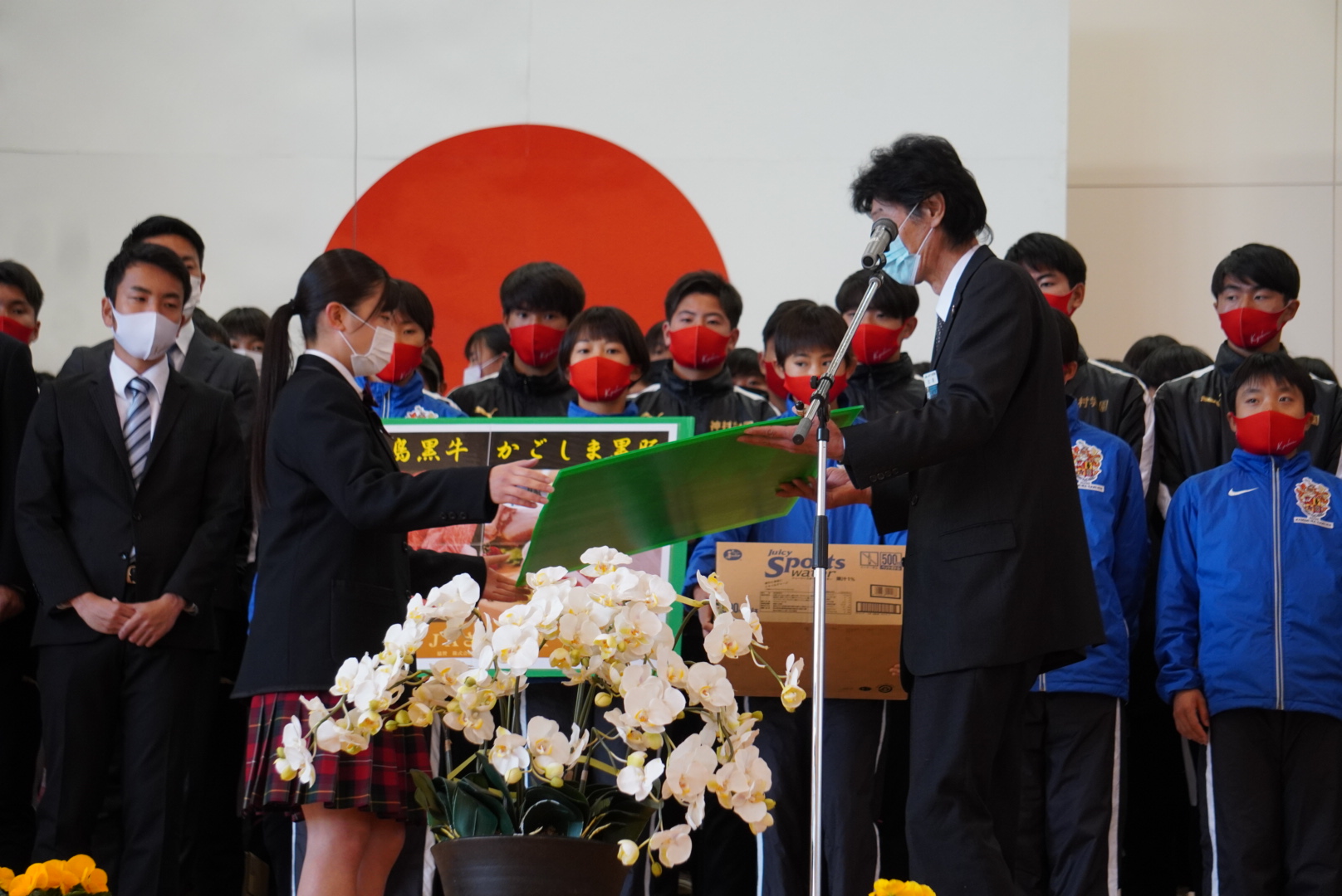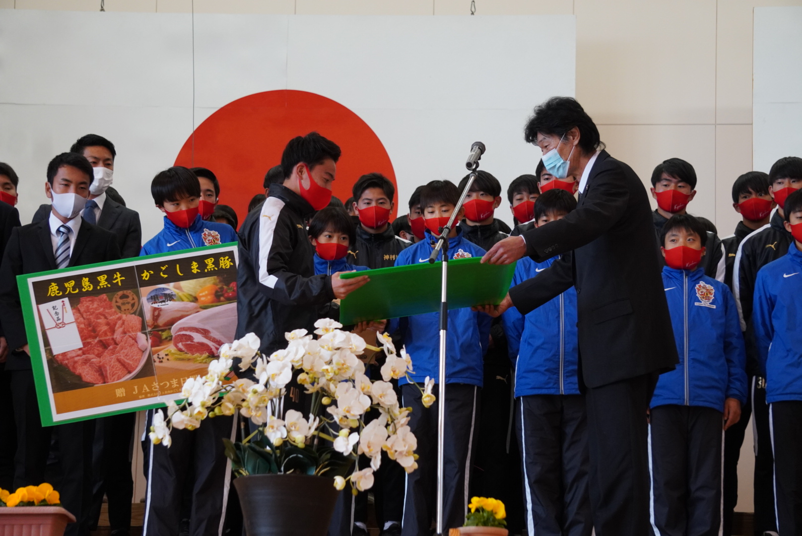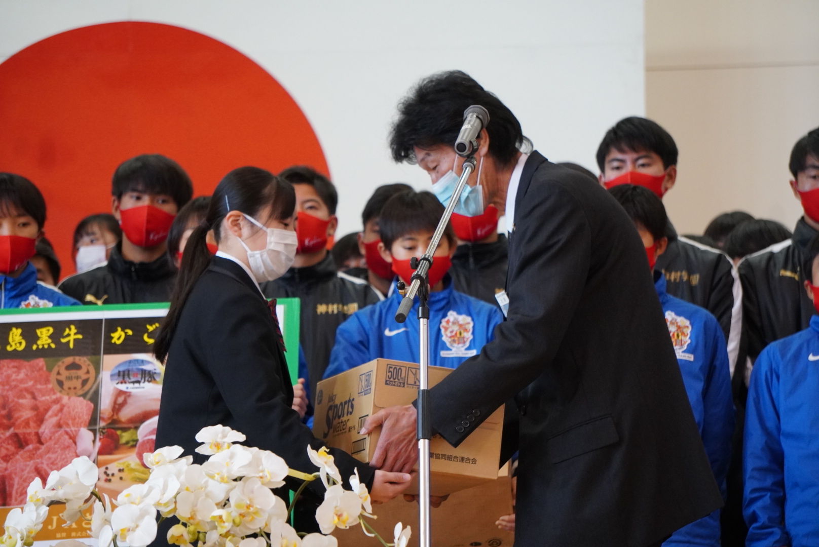 JAさつま日置様より 農畜産物贈呈式🥩 2021.12.14高等部 お知らせ吹奏楽女子サッカー女子ソフトボール男子サッカー駅伝 全国大会に出場する5団体(駅伝部,男子サッカー部,女子サッカー部,吹奏楽部,ソフト部)に対し,JAさつま日置様より農畜産物贈呈式が行われました。 栄養をしっかりとって,全国大会に挑みます。ありがとうございました。