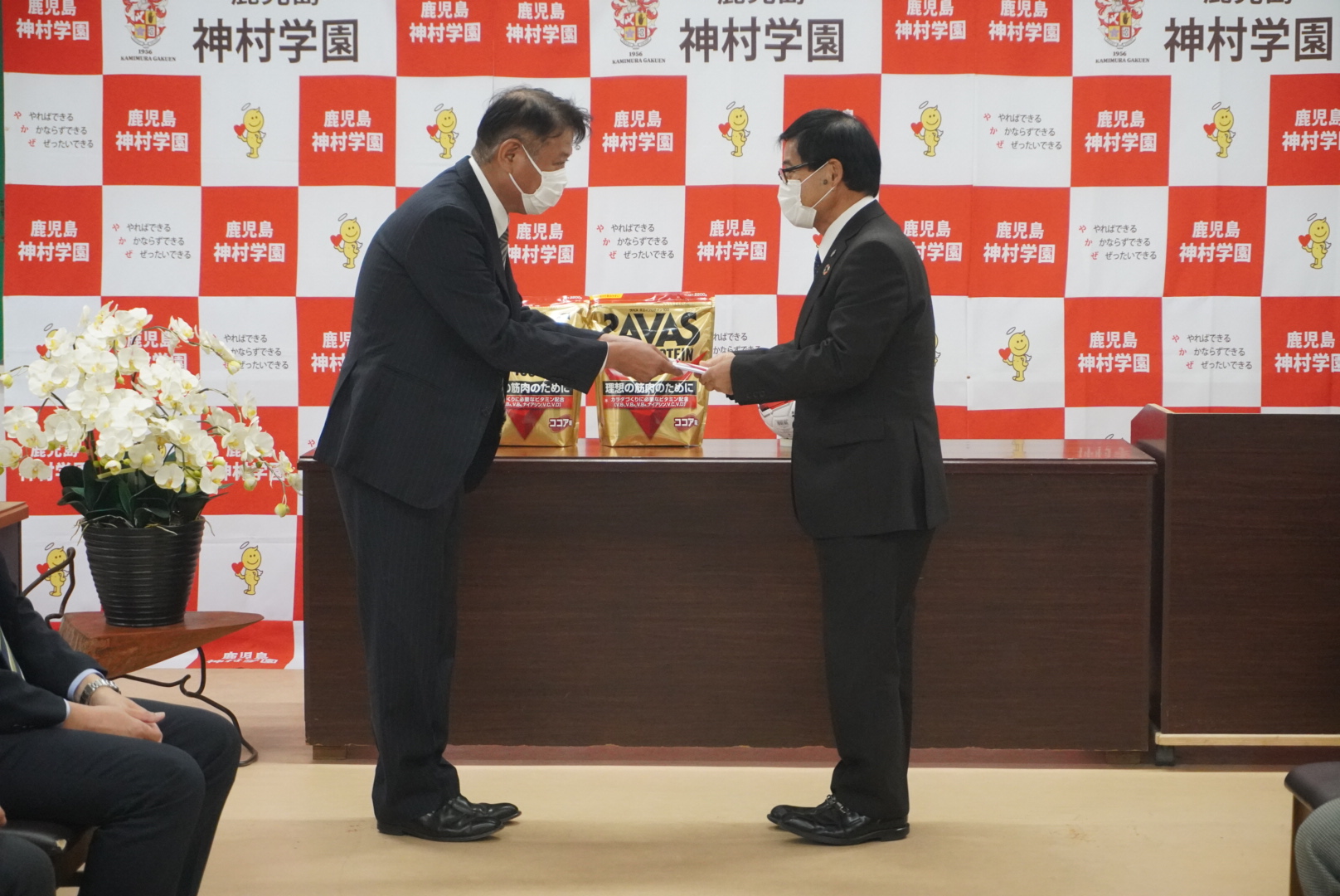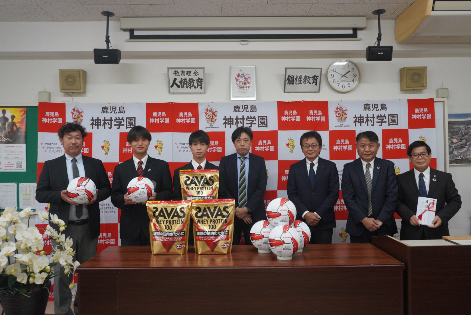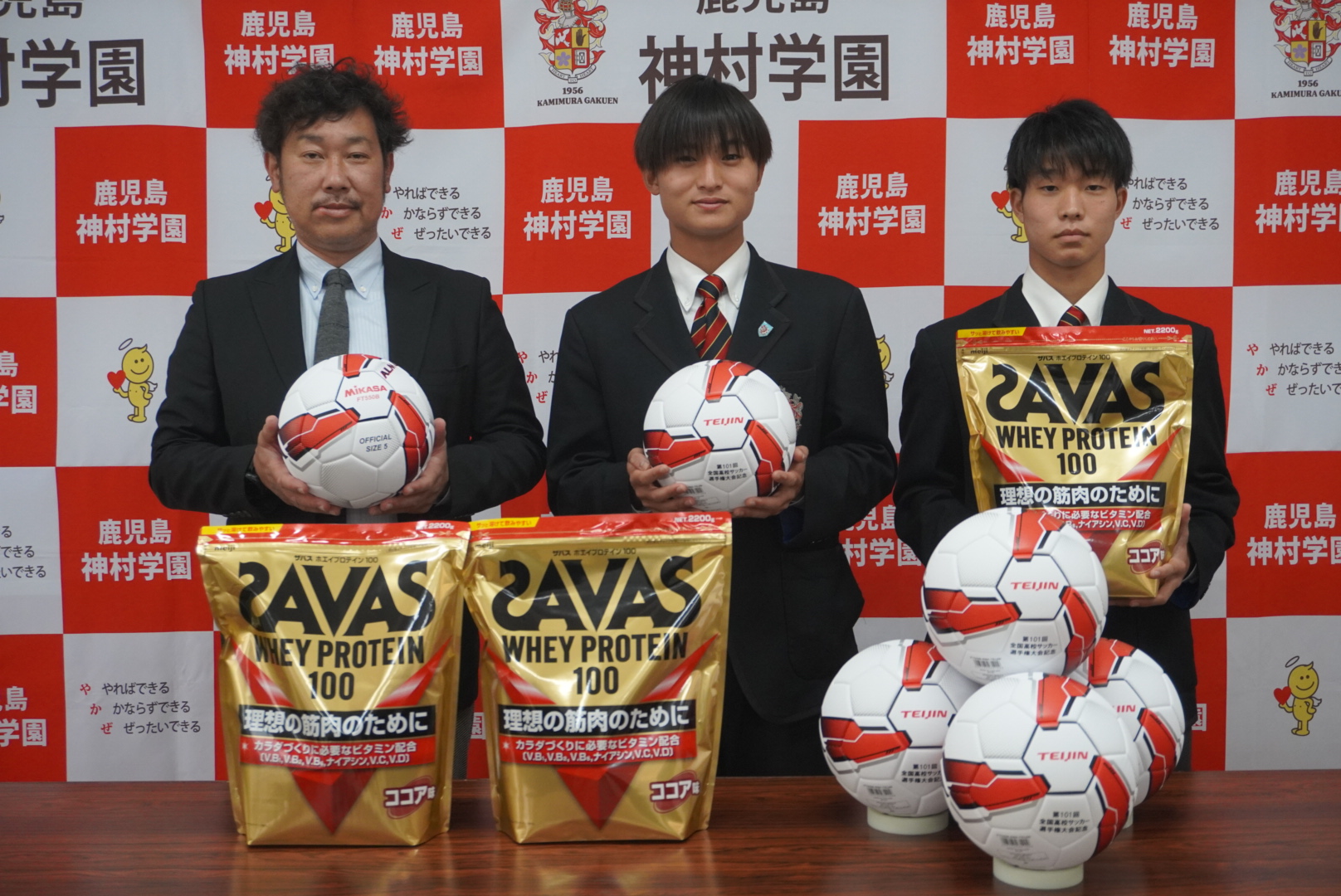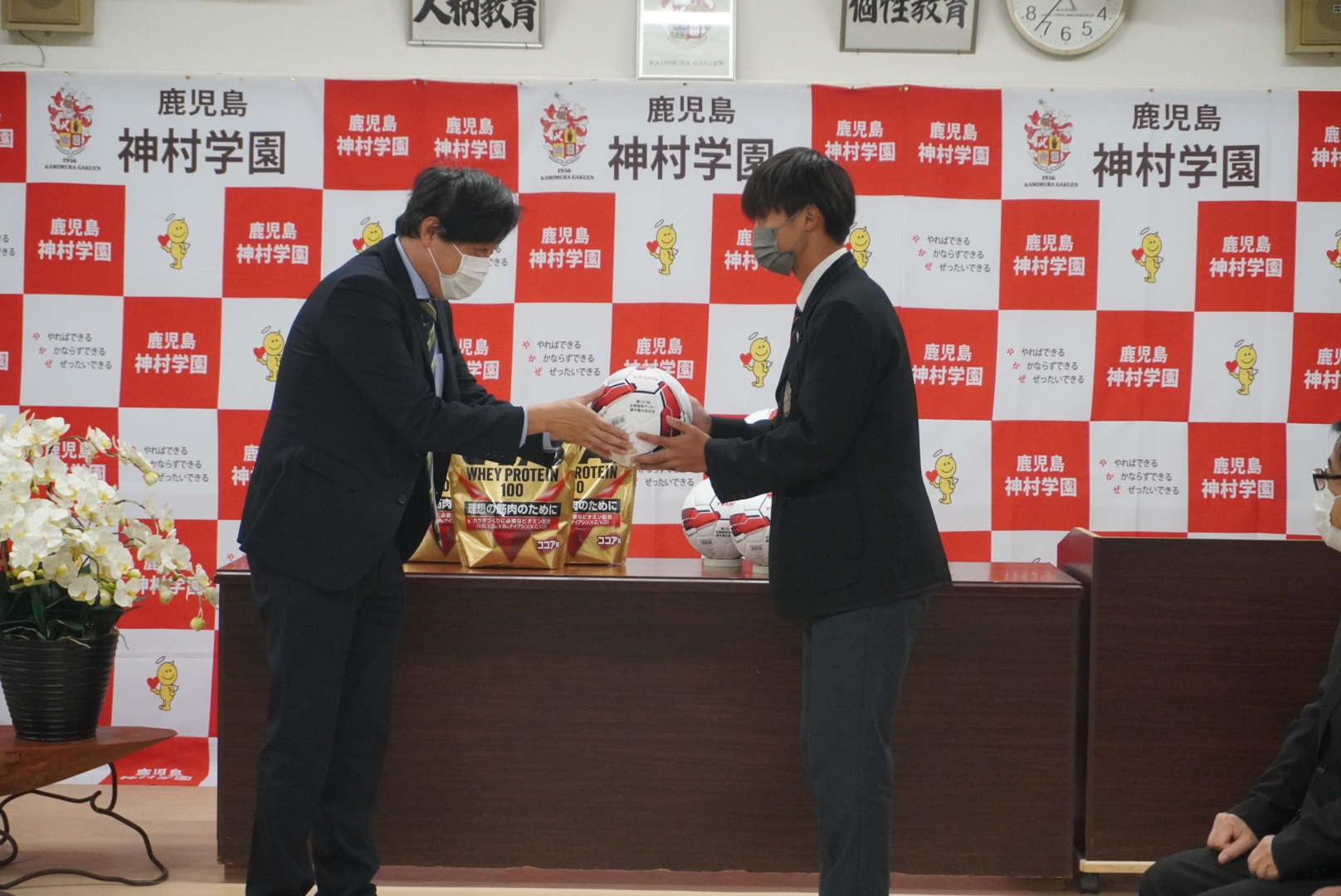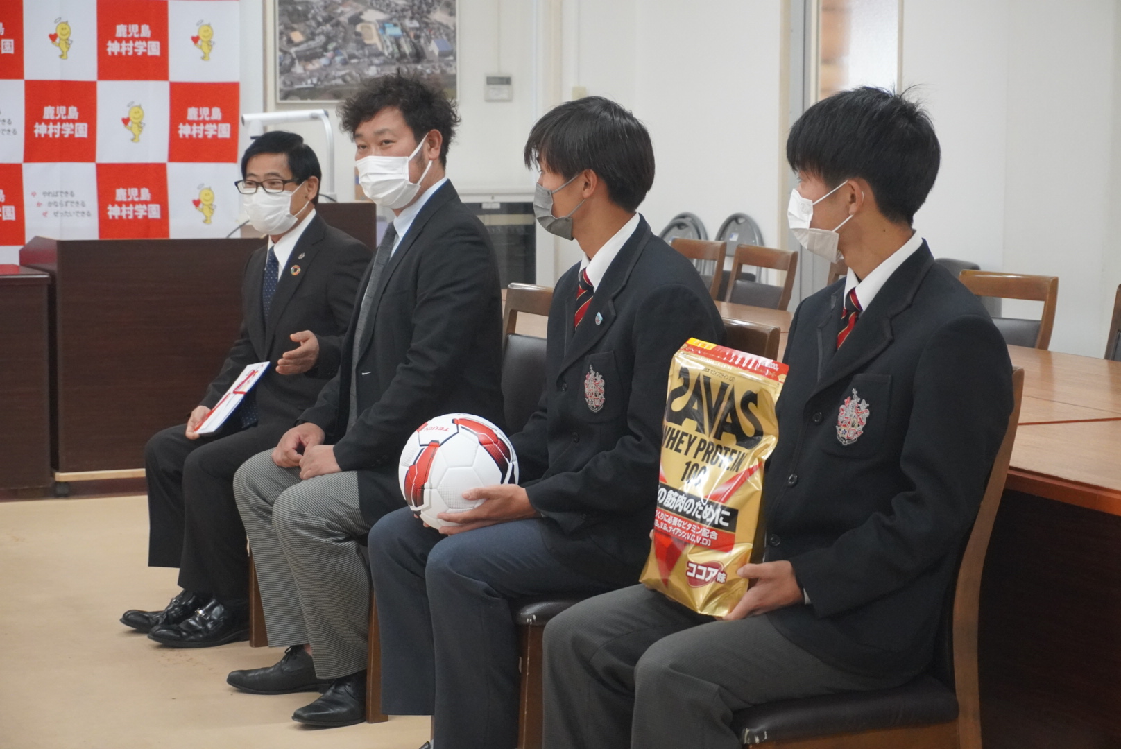 ⚽️第101回全国高校サッカー選手権大会に向けて贈呈式✨ 2022.12.01高等部 お知らせ 第101回全国高校サッカー選手権大会の協賛社である、帝人ヘルスケア株式会社様よりサッカーボールとボールケース、株式会社明治様よりプロテインを頂き、KYT鹿児島読売テレビ様からは激励金を頂きました。しっかり全国大会に向けて頑張ります。ありがとうございました。