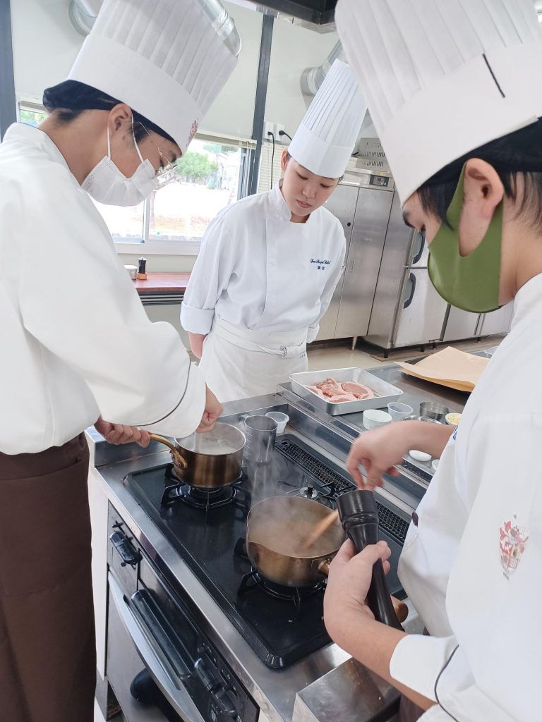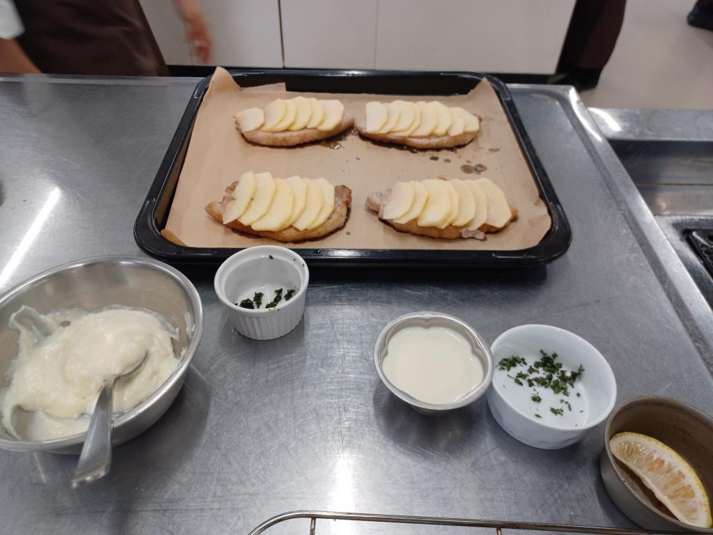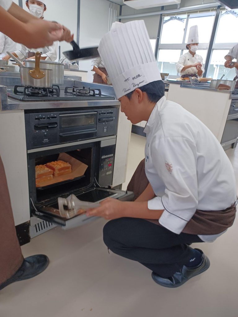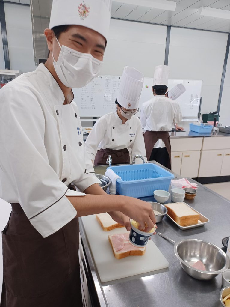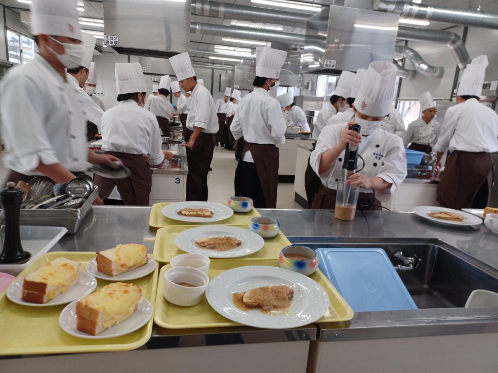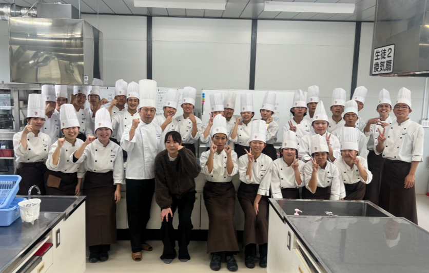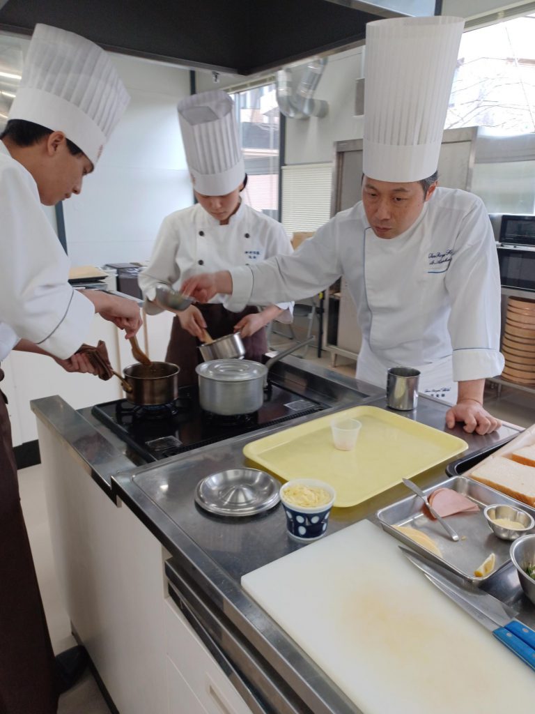 11.10 調理コース2年生 特別調理実習 with サンロイヤルホテル料理長 天川伸也シェフ 2025.11.10高等部 お知らせ調理科 鹿児島サンロイヤルホテル スカイラウンジ フェニックス料理長 天川伸也シェフによる特別調理実習がありました。 天川シェフと本校卒業生の諏訪さんからも指導を受けることができました。 ありがとうございます。 <本日のメニュー> クロックムッシュ 豚ロースとりんごのロースト エビとトマトのスープ 本校卒業生の諏訪 葵さん 後輩たちへの指導ありがとうございます。みんなで ハイチーズ! ありがとうございました。またご指導よろしくお願いします!