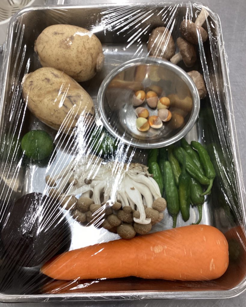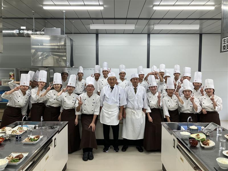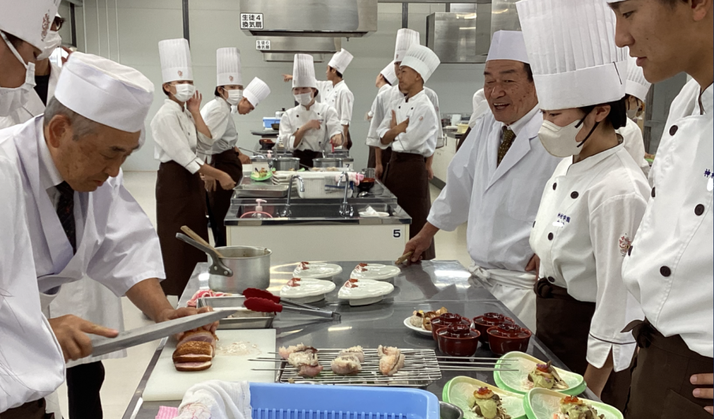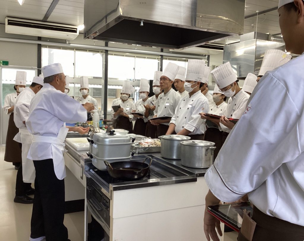 今回は鹿児島県調理師協会名誉会長で平成29年度「全技連マイスター」令和元年度には卓越した技能者に贈られる「現代の名工」を受賞されアクアガーデンホテル福丸の名誉料理長として料理を監修されている床次 信也先生と「厚生労働大臣賞」を受賞された中原別荘の料理長の田中 隆幸先生による特別調理実習が行われました。