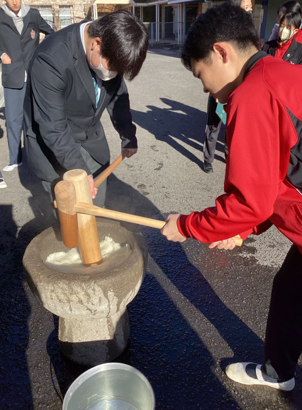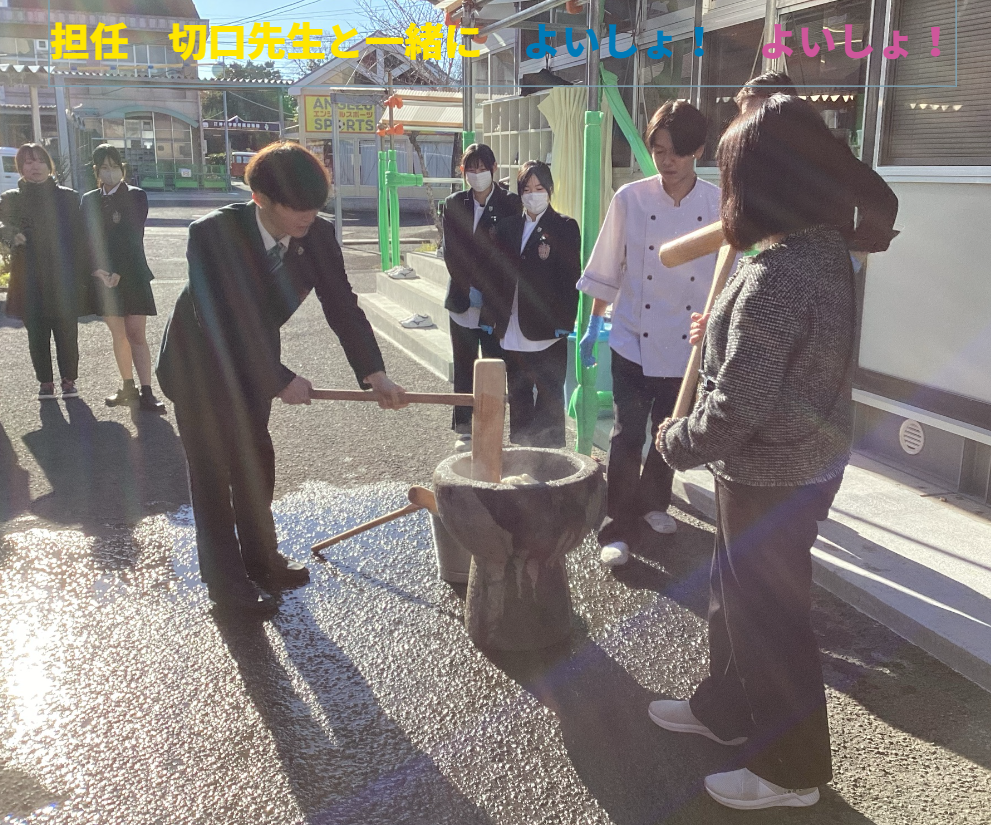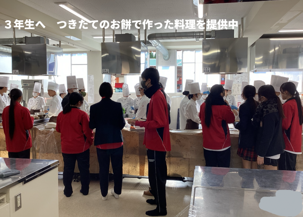 調理科恒例 2年生による1,3年生+先生方へのおもてなし餅つき大会です。(現在,耐震工事中のため,今年は,プレハブの調理実習室前で!)