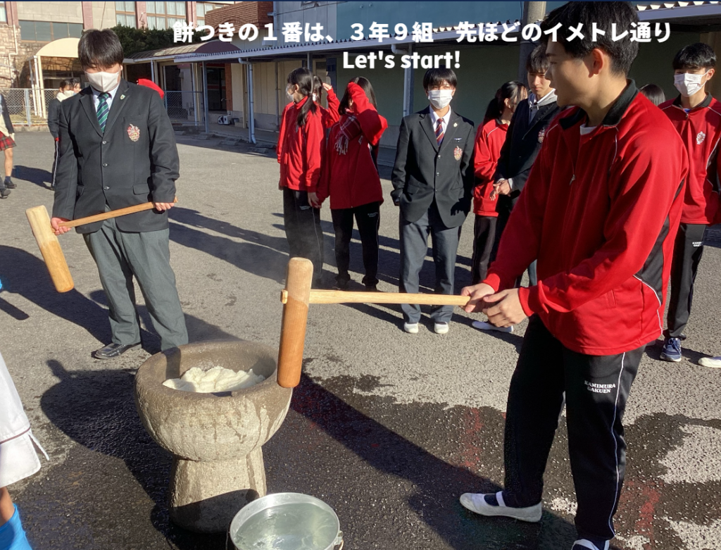 餅つき スタート!今年は、3年9組から 順番に