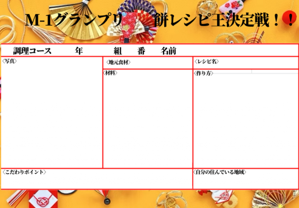 調理科生(約150人)は、冬休みの期間 お餅を使ったレシピを考え提出済み。 エントリーされたレシピは (名前を消して)壁に掲示してあります。