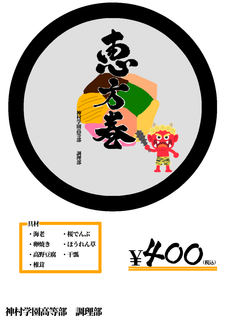 2.3 (予告) ☆調理科☆節分マルシェOPEN 調理部&パティシエ部による恵方巻&恵方ロール 校内販売します! 2026.01.30高等部 お知らせ調理科 2月3日(火)昼休み 節分マルシェOPEN 販売場所:ドーム内 K. Marche 販売時間: 1回目 11:50~ 2回目 12:50~ 校内の生徒や職員対象販売です! 調理部 と パティシエ部の作る恵方巻&恵方ロールを それぞれ販売します。 👇写真は,イメージです 🙇 *恵方巻 (1種類) ¥400 (税込) 100個 販売予定 *恵方ロール (3種類) ¥400 (税込) 各30個 販売予定 プレーン チョコ 抹茶 の3種類 ぜひお買い求めください。