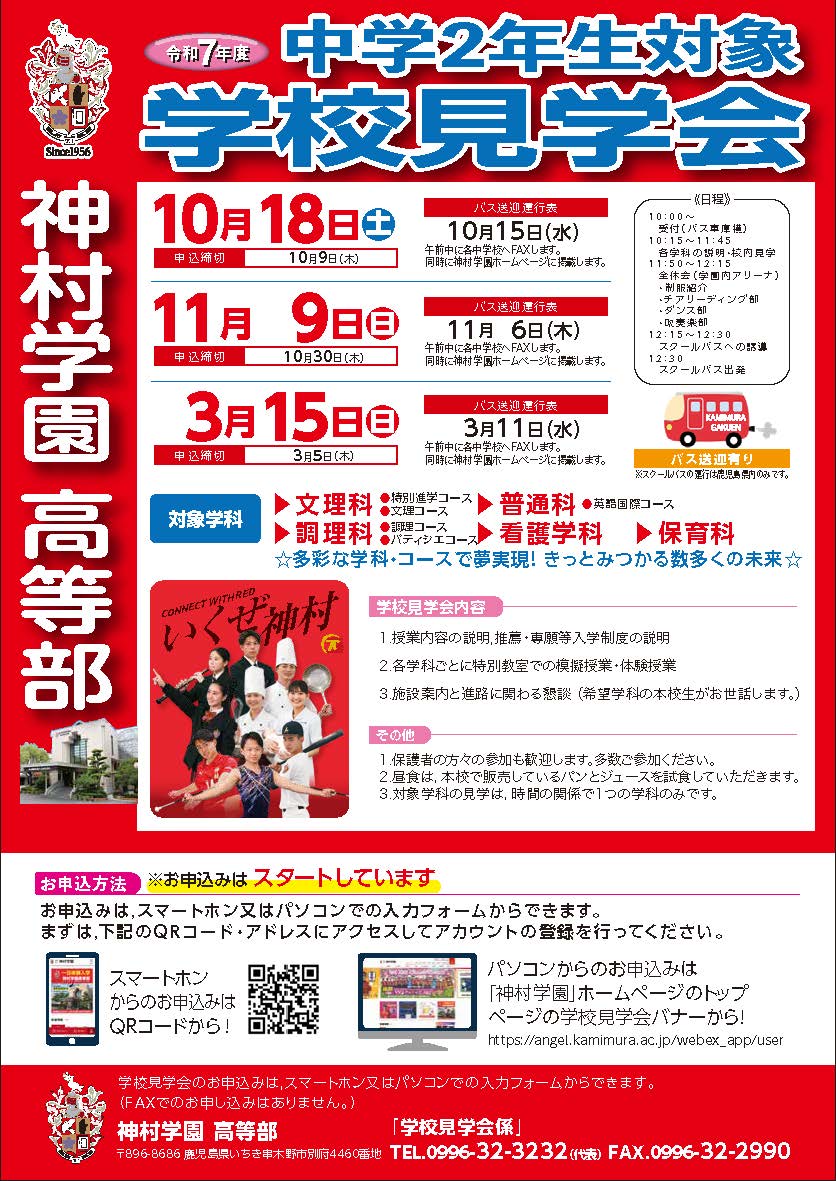 中学2年生対象学校見学会(11月9日開催)※締切は10月30日まで 2025.10.29高等部 学校説明会 PDFダウンロード WEB申し込みはこちらからアクセスいただけます (生徒・保護者様はこちらから) 生徒画面へ (中学教職員様はこちらから) 中学校管理画面へ