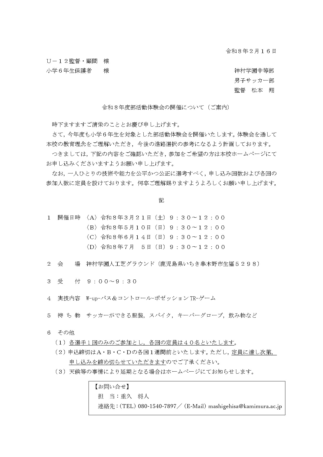 令和8年度 中等部 男子サッカー部対象 部活動体験会のご案内⚽ 2026.02.16中等部 お知らせ お申し込みは下記の申し込みフォームをご利用ください。 中等部オープンスクール申し込みフォーム – 学校法人神村学園 (kamimura.ac.jp)