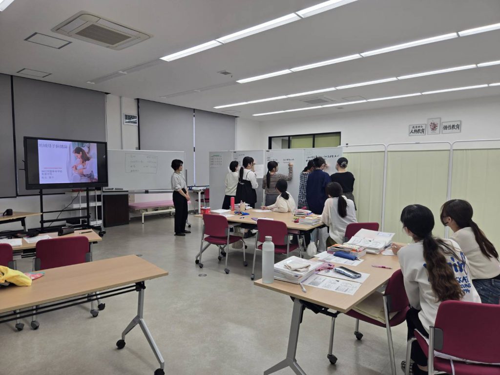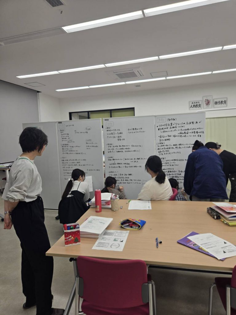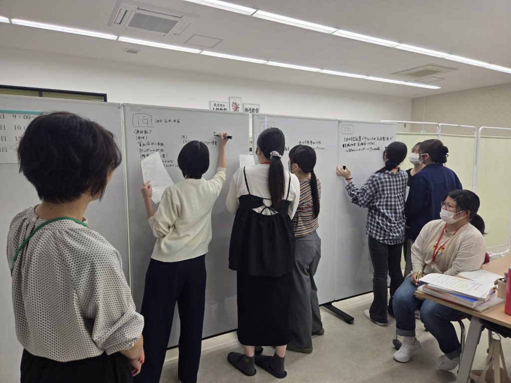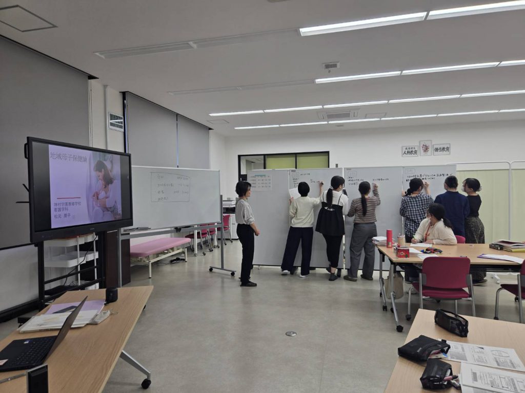 地域母子保健論の授業、グループワークした内容をホワイトボードで共有し、お互いの学びを同時進行で深める工夫をしています。