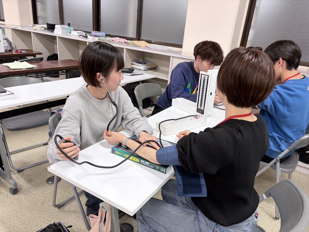 理学療法評価法 2026.04.24専修学校 お知らせ 神村学園専修学校 理学療法学科1年生✨✨ 理学療法学科1年生は理学療法評価法という授業の中で血圧測定について勉強しました❗️ 初めて触る器具や言葉も実技を通して楽しみながら覚えていってくれると嬉しいです😊